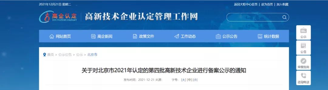根據(jù)《高新技術(shù)企業(yè)認(rèn)定管理辦法》(國科發(fā)火〔2016〕32號(hào))和《高新技術(shù)企業(yè)認(rèn)定管理工作指引》(國科發(fā)火〔2016〕195號(hào))有關(guān)規(guī)定,現(xiàn)將北京市認(rèn)定管理機(jī)構(gòu)2021年認(rèn)定的第四批3326家高新技術(shù)企業(yè)(企業(yè)名單詳見附件)進(jìn)行備案公示,公示期為10個(gè)工作日。