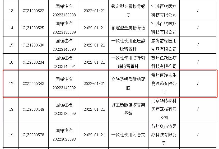 2022年1月26日,常州百瑞吉生物醫(yī)藥有限公司生產(chǎn)的產(chǎn)品“交聯(lián)透明質(zhì)酸鈉凝膠”獲NMPA批準(zhǔn)上市(國械注準(zhǔn)20223140092),產(chǎn)品用于預(yù)防盆腹腔術(shù)后粘連,恭喜百瑞吉產(chǎn)品獲得市場準(zhǔn)入。