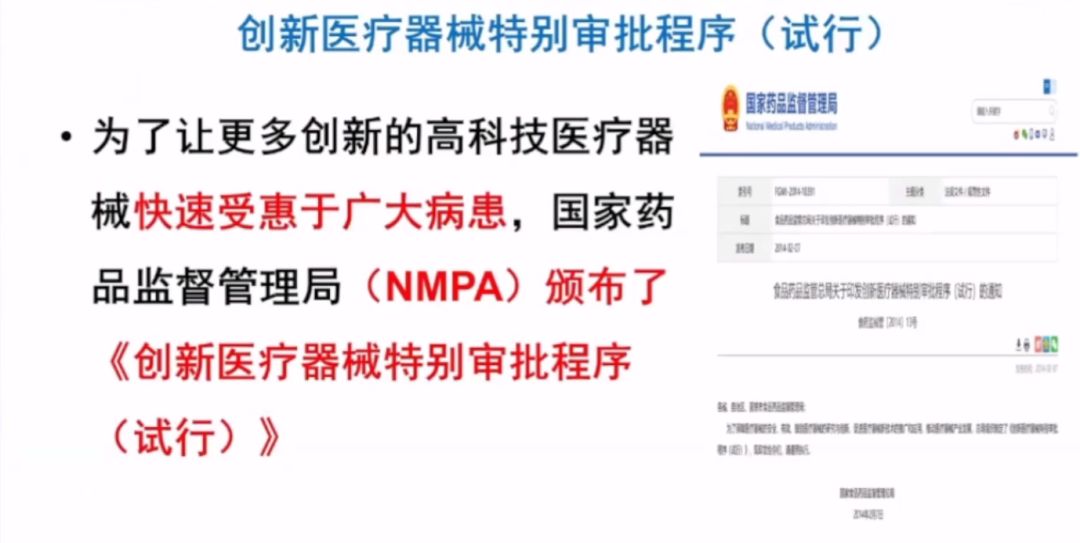 2014年2月7日,為保障醫(yī)療器械的安全有效,鼓勵醫(yī)療器械的研究與創(chuàng)新,促進醫(yī)療器械新技術的推廣應用,推動醫(yī)療器械產業(yè)發(fā)展,國家藥監(jiān)局制定了《創(chuàng)新醫(yī)療器械特別審批程序(試行)》,政策從創(chuàng)新產品定義、提交資料、證明性文件、等方面規(guī)定了創(chuàng)新器械審批流程和要點。