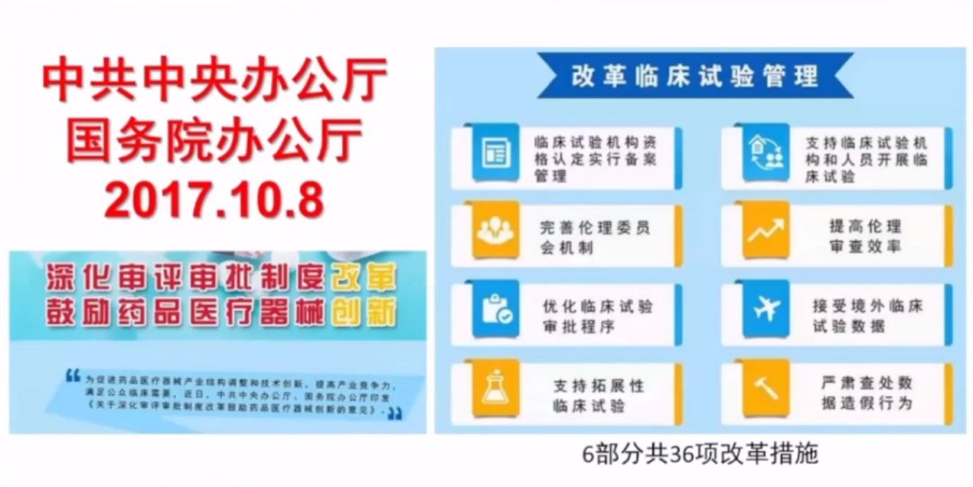 2017年10月8日,為鼓勵藥品醫(yī)療器械科技創(chuàng)新,提高上市產品質量和產業(yè)競爭力,滿足公眾臨床需要,中共中央辦公廳、國務院辦公廳印發(fā)了《關于深化審評審批制度改革鼓勵藥品醫(yī)療器械創(chuàng)新的意見》。在多方面深化了審批制度,包括改革臨床試驗管理、加快上市審評審批、促進藥品創(chuàng)新和仿制藥發(fā)展、加強藥品醫(yī)療器械全生命周期管理、提升技術支撐能力、加強組織實施等。