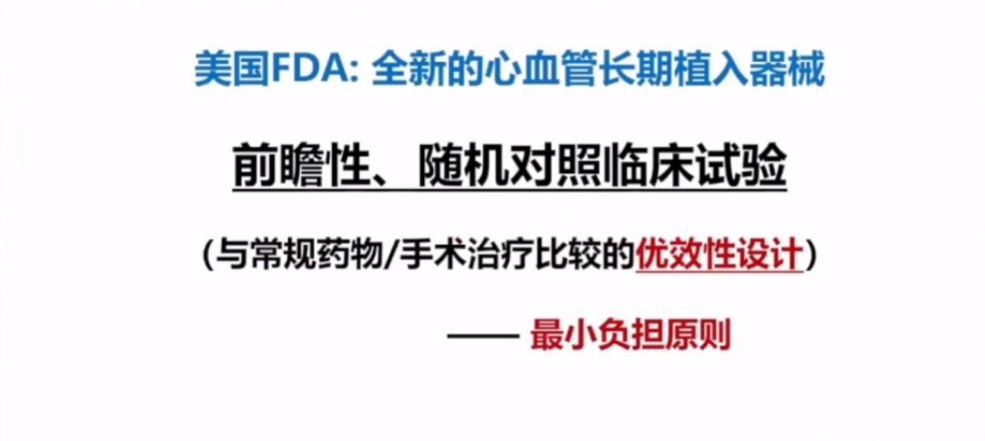 李衛(wèi)教授講到,美國FDA針對全新的心血管長期植入器械,也要做前瞻性、隨機對照臨床試驗。創(chuàng)新產品無同類產品可對照,可與常規(guī)的藥物/手術治療比較的優(yōu)效性設計,也就是最小負擔原則。