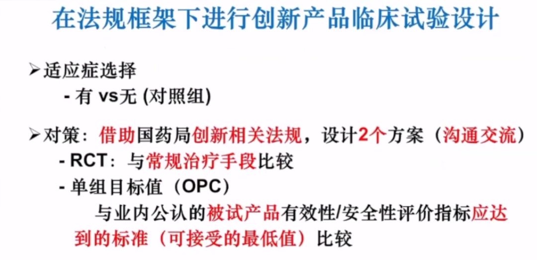 在法規(guī)框架下進行創(chuàng)新產品的臨床試驗設計,李教授認為最關鍵的是適應癥的選擇問題(有無對照組),可設計出2個方案,以便和國家藥監(jiān)局相關部門溝通。