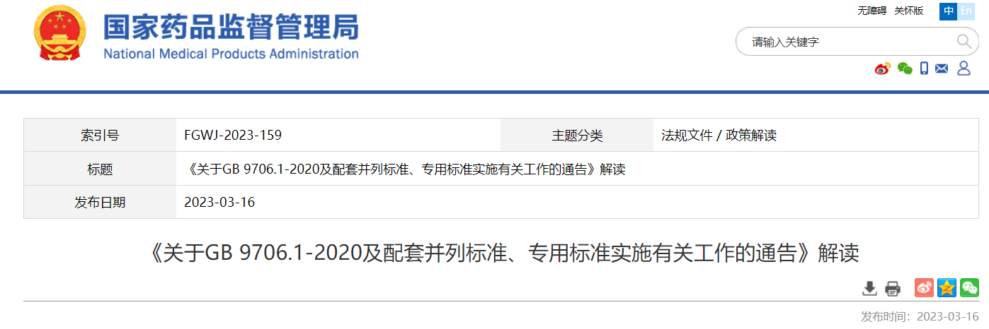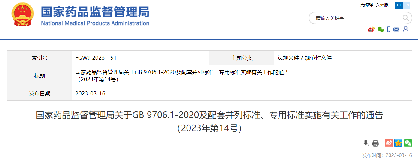 關于GB 9706.1-2020及配套并列標準、專用標準實施有關工作的通告(2023年第14號)及解讀