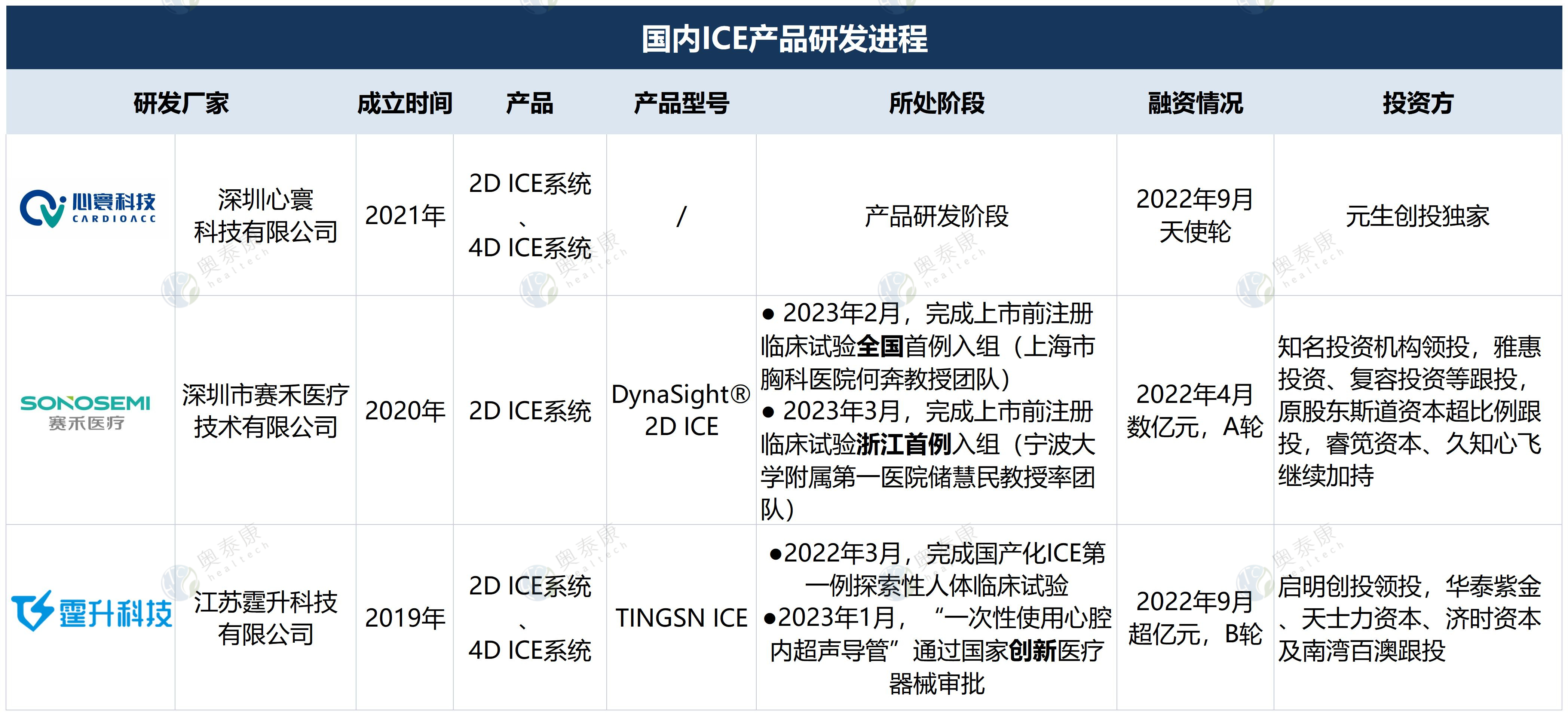 全球ICE市場中,歐美企業(yè)占主要份額,強(qiáng)生、雅培、西門子、飛利浦、GE醫(yī)療、波士頓科學(xué)等均已布局,而國內(nèi)ICE起步較晚,仍處發(fā)展初期,相關(guān)產(chǎn)品和市場滲透率較低,企業(yè)具有較大的發(fā)展空間,國內(nèi)研發(fā)廠商有塞禾醫(yī)療、心寰科技、霆升科技、澤樸醫(yī)療、歡影醫(yī)療等。隨著ICE在臨床應(yīng)用優(yōu)勢(shì)的凸顯,ICE賽道逐漸升溫并獲得資本青睞,國內(nèi)部分ICE廠家已在2022年完成新一輪融資。