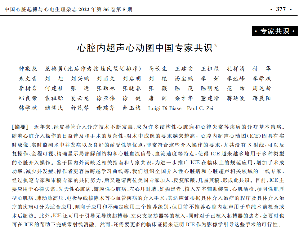 鑒于目前國際上缺乏相關(guān)指南,為促進和規(guī)范ICE的臨床應(yīng)用,為臨床醫(yī)生提供指導(dǎo),進一步完善心血管介入診斷和治療方案,2022年10月,由國內(nèi)外數(shù)十位頂尖專家學(xué)者編寫完成全球首個心腔內(nèi)超聲專家共識,聯(lián)合在Frontiers in Cardiovascular Medicine上發(fā)表,推動了心腔內(nèi)超聲心血管介入領(lǐng)域的的規(guī)范化應(yīng)用。
