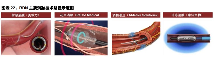 交感神經(jīng)過度興奮可使血壓上升,高血壓死亡風(fēng)險高、治療負(fù)擔(dān)重,盡管已上市降壓藥物眾多,但仍存在大量藥物依從性差耐藥患者。經(jīng)腎動脈去交感神經(jīng)術(shù)(RDN)是指通過介入治療方法(經(jīng)股動脈、橈動脈),破壞腎交感傳入和傳出神經(jīng),減弱腎和全身交感神經(jīng)活動,從而降低血壓,實(shí)現(xiàn)一次微創(chuàng)手術(shù)長期平穩(wěn)降壓。RDN技術(shù)已經(jīng)歷10余年發(fā)展,可基于射頻消融、超聲消融、冷凍消融、化學(xué)消融等方式,其中主要以射頻消融(rRDN)和超聲消融(uRDN)為主導(dǎo)。