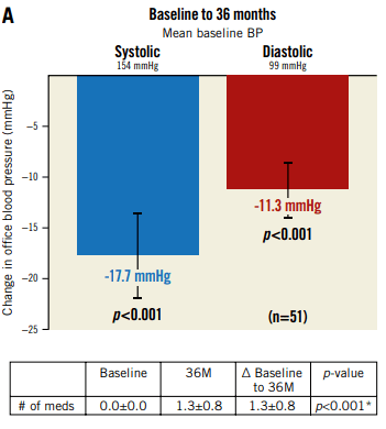 試驗(yàn)結(jié)果:36個月的隨訪資料顯示,當(dāng)兩組使用了治療強(qiáng)度相似的抗高血壓藥物時,RDN組動態(tài)收縮壓降幅顯著高于假手術(shù)組,RDN治療與Sham相對比,顯著降低患者血壓可達(dá)3年,且無安全性問題,這一療法可作為高血壓患者藥物治療的替代方案。