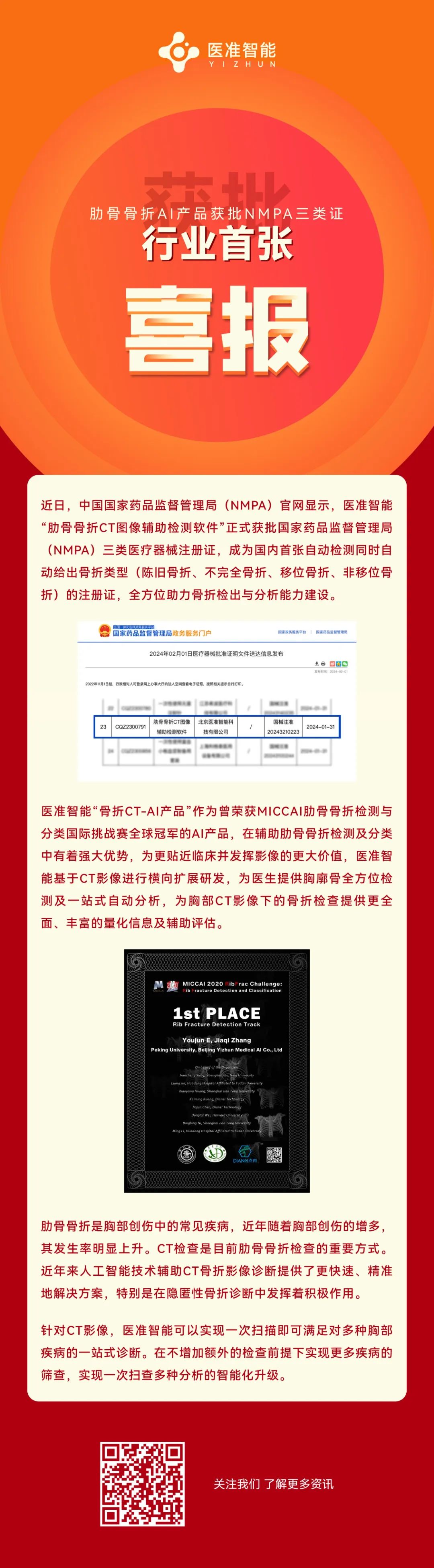 2024年1月31日,經(jīng)國家藥品監(jiān)督管理局公示,北京醫(yī)準智能科技有限公司的肋骨骨折CT圖像輔助檢測軟件(國械注準20243210223)獲得NMPA批準上市,奧泰康承擔本項目部分臨床試驗工作,系2024年奧泰康助力獲得的第二張三類醫(yī)療器械注冊證。