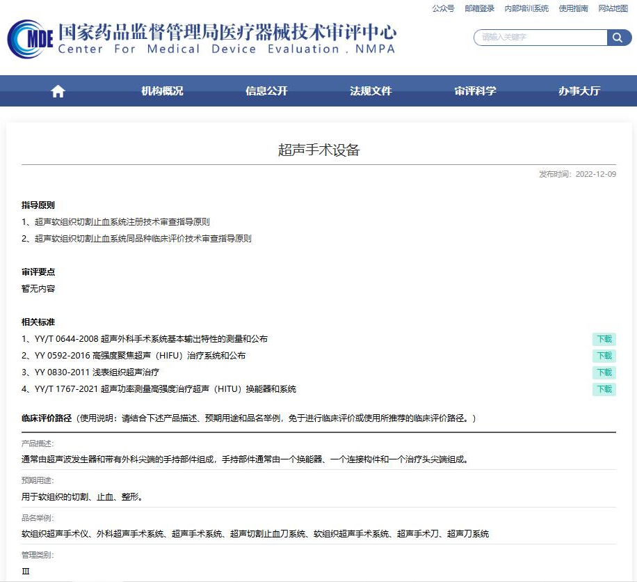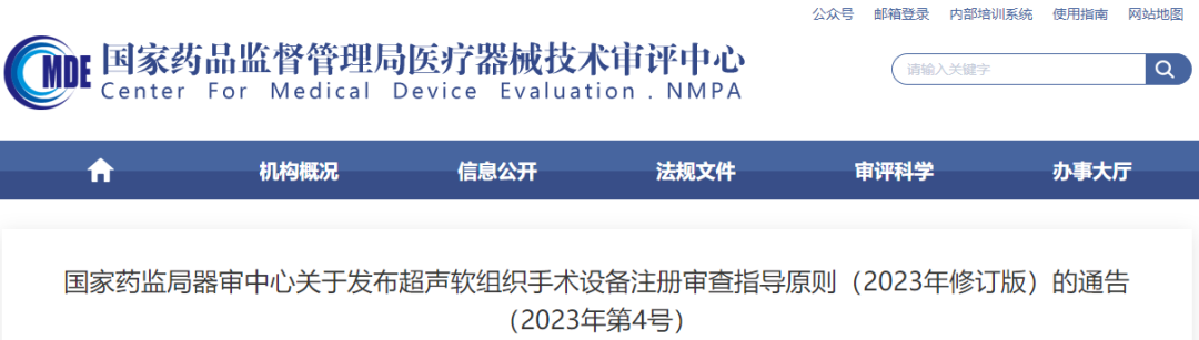 ●2023年3月31日,國家藥監(jiān)局器審中心修訂發(fā)布了《超聲軟組織手術設備注冊審查指導原則》(2023年修訂版)。(附件:超聲軟組織手術設備注冊審查指導原則(2023年修訂版