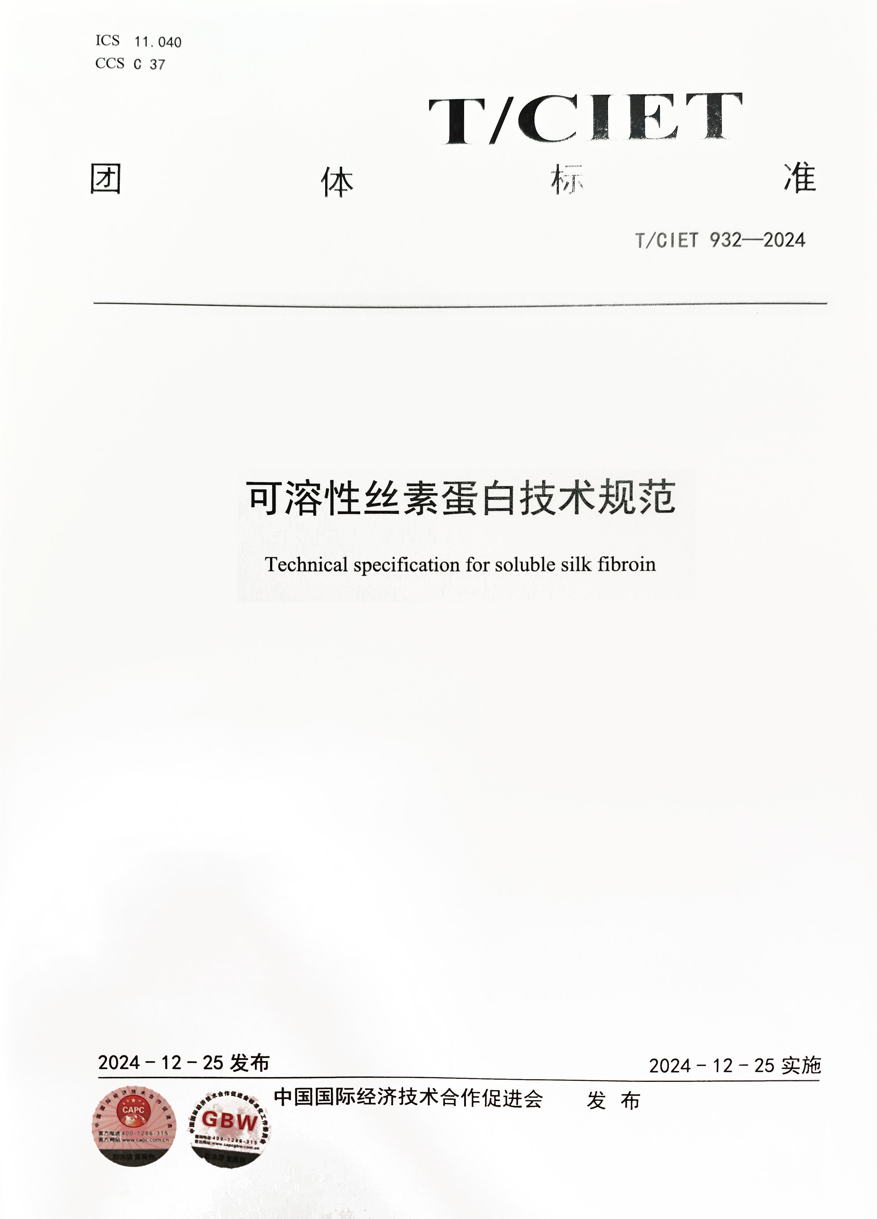 T/CIET 932-2024標準是國內首個針對可溶性絲素蛋白的綜合性技術規(guī)范,明確了產品的關鍵性能指標、試驗方法及質量控制要求,為可溶性絲素蛋白的生產和應用提供了統(tǒng)一的技術依據(jù)。奧泰康蘇州CDMO中心在標準制定過程中,結合自身在絲素蛋白提取、純化及應用方面的創(chuàng)新成果,助力標準更具科學性和可操作性,推動行業(yè)向規(guī)范化、高質量發(fā)展邁進,此外也參與過多項絲素蛋白相關團體標準的制定,提供諸多有效建議,未來,也將持續(xù)助力生物材料領域的高水平發(fā)展。
