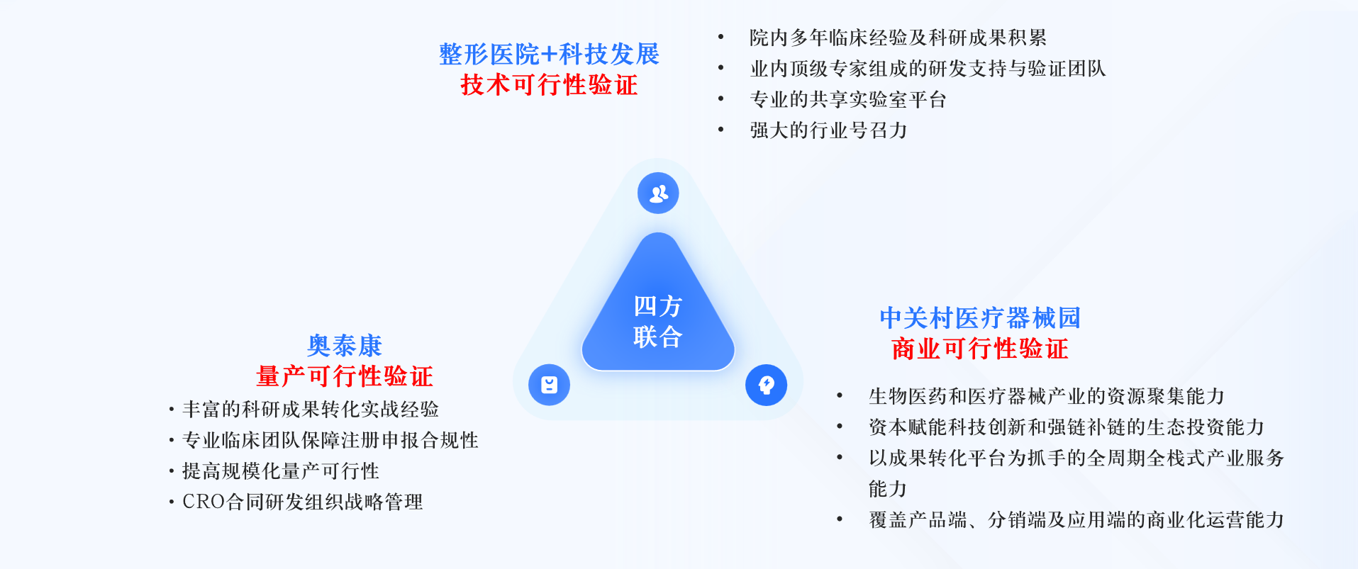 北京市整形醫(yī)學概念驗證中心項目,由四家單位聯(lián)合申報實施。其中北京八大處整形科技發(fā)展有限公司聯(lián)合中國醫(yī)科院整形外科醫(yī)院完成技術可行性驗證,北京奧泰康醫(yī)藥技術開發(fā)有限公司負責量產(chǎn)化驗證,中關村醫(yī)療器械園有限公司完成商業(yè)化驗證,四方相互協(xié)同,構(gòu)建“醫(yī)研產(chǎn)銷”一體化生態(tài)。