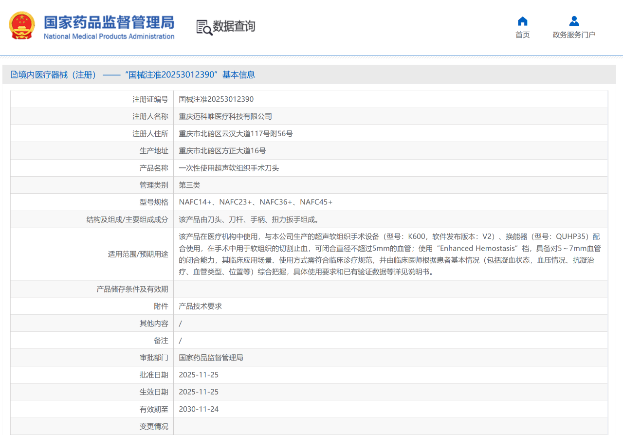 2025年11月,經(jīng)國家藥品監(jiān)督管理局公示,重慶邁科唯醫(yī)療科技有限公司研發(fā)的一次性使用超聲軟組織手術(shù)刀頭(國械注準(zhǔn)20253012390)獲得NMPA批準(zhǔn)上市,奧泰康提供市場準(zhǔn)入MA解決方案。